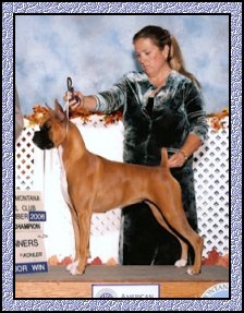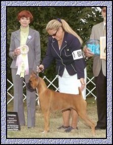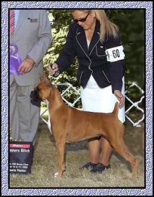 CH Ensign's Bella Vita “Sophie” came into this world as the only girl out of her beautiful Mom Brooklyn and the handsome Dad Sabre. With complications in her original sale, Sophie came back to live with me and then when a dear friend lost her dog, I gave Sophie to Cathe Nathman to co-own with me. Sophie's first time in the ring she was WB, and never looked back her second show weekend was ABC Regionals in Spokane, Washington. She won a Grand Sweepstakes under Nancy Schepis, the next day she won her first major under Peter Baynes, I thanked him for putting up my plain little girl and he said "what plain girl". There was never anything plain about Sophie, she glided around the ring with confidence and style. The next day at ABC Regionals she went on to win WB & BOW, under the respected judge Jack Ireland. Her third show weekend and she needed one point to finish, we traveled to the tuff Montana circuit, where she won the first day, finishing her Championship, under the honorable Mr. Larry Sinclair, and beautifully handled by Cheryl Cates. Sophie and her new owner Cathe went to the ABC and she competed twice in the BOB, both times she was the only plain dog or bitch to make the final cut.